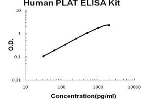 - human PLAT ELISA Kit was based on standard sandwich enzyme-linked immune-sorbent assay technology. A monoclonal antibody from mouse specific for PLAT has been precoated onto 96-well plates. Standards(CHO, M1-P562) and test samples are added to the wells, a biotinylated detection polyclonal antibody from goat specific for PLAT is added subsequently and then followed by washing with PBS or TBS buffer. Avidin-Biotin-Peroxidase Complex was added and unbound conjugates were washed away with PBS or TBS buffer. HRP substrate TMB was used to visualize HRP enzymatic reaction. TMB was catalyzed by HRP to produce a blue color product that changed into yellow after adding acidic stop solution. The density of yellow is proportional to the human PLAT amount of sample captured in plate.