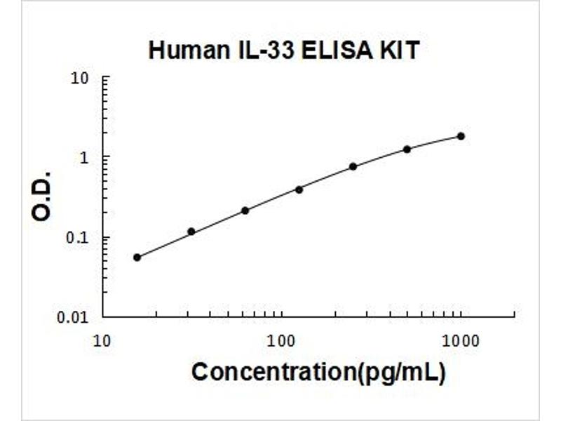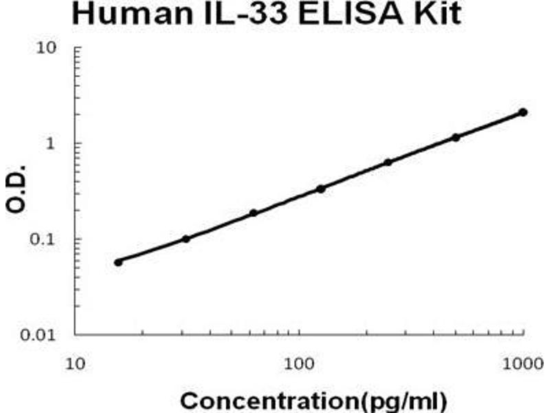 - human IL-33 ELISA Kit was based on standard sandwich enzyme-linked immune-sorbent assay technology. A monoclonal antibody from mouse specific for IL-33 has been precoated onto 96-well plates. Standards(E.coli, S112-T270) and test samples are added to the wells, a biotinylated detection polyclonal antibody from goat specific for IL-33 is added subsequently and then followed by washing with PBS or TBS buffer. Avidin-Biotin-Peroxidase Complex was added and unbound conjugates were washed away with PBS or TBS buffer. HRP substrate TMB was used to visualize HRP enzymatic reaction. TMB was catalyzed by HRP to produce a blue color product that changed into yellow after adding acidic stop solution. The density of yellow is proportional to the human IL-33 amount of sample captured in plate.
