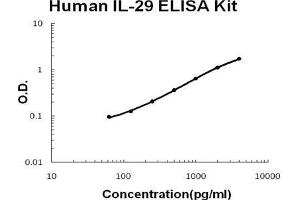 - human IL-29 ELISA Kit was based on standard sandwich enzyme-linked immune-sorbent assay technology. A monoclonal antibody from mouse specific for IL-29 has been precoated onto 96-well plates. Standards(NSO, G20-T200) and test samples are added to the wells, a biotinylated detection polyclonal antibody from goat specific for IL-29 is added subsequently and then followed by washing with PBS or TBS buffer. Avidin-Biotin-Peroxidase Complex was added and unbound conjugates were washed away with PBS or TBS buffer. HRP substrate TMB was used to visualize HRP enzymatic reaction. TMB was catalyzed by HRP to produce a blue color product that changed into yellow after adding acidic stop solution. The density of yellow is proportional to the human IL-29 amount of sample captured in plate.
