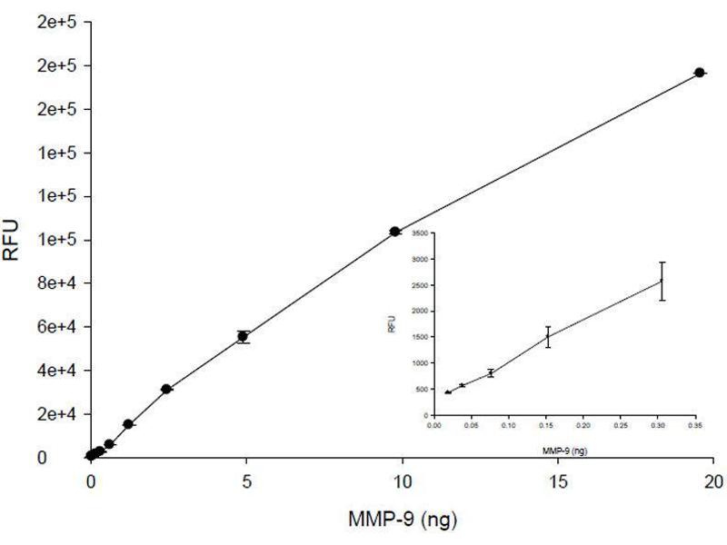 - SensoLyte® 520 MMP-9 Assay Kit uses a 5-FAM (fluorophore) and QXL520™ (quencher) labeled FRET peptide substrates for continuous measurement of the enzyme activities. In an intact FRETpeptide, the fluorescence of 5-FAM is quenched by QXL520™. Upon the cleavage of the FRET peptide by MMP-9, the fluorescence of 5-FAM is recovered, and can be continuously monitored at excitation/emission = 490 nm/520 nm. With superior fluorescence quantum yield and longer emission wavelength, 5-FAM/QXL520™ based FRET peptide is less interfered by the autofluorescence of test compounds and cellular components and provides better assay sensitivity.