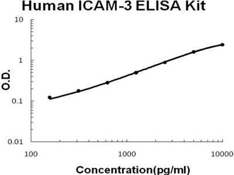 - human ICAM-3 ELISA Kit was based on standard sandwich enzyme-linked immune-sorbent assay technology. A monoclonal antibody from mouse specific for ICAM-3 has been precoated onto 96-well plates. Standards(NSO, Q30-H485, homodimer) and test samples are added to the wells, a biotinylated detection polyclonal antibody from goat specific for ICAM-3 is added subsequently and then followed by washing with PBS or TBS buffer. Avidin-Biotin-Peroxidase Complex was added and unbound conjugates were washed away with PBS or TBS buffer. HRP substrate TMB was used to visualize HRP enzymatic reaction. TMB was catalyzed by HRP to produce a blue color product that changed into yellow after adding acidic stop solution. The density of yellow is proportional to the human ICAM-3 amount of sample captured in plate.
