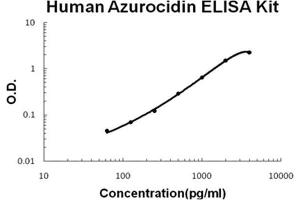 - human Azurocidin ELISA Kit was based on standard sandwich enzyme-linked immune-sorbent assay technology. A monoclonal antibody from mouse specific for Azurocidin has been precoated onto 96-well plates. Standards(NSO, I27-P248) and test samples are added to the wells, a biotinylated detection polyclonal antibody from goat specific for Azurocidin is added subsequently and then followed by washing with PBS or TBS buffer. Avidin-Biotin-Peroxidase Complex was added and unbound conjugates were washed away with PBS or TBS buffer. HRP substrate TMB was used to visualize HRP enzymatic reaction. TMB was catalyzed by HRP to produce a blue color product that changed into yellow after adding acidic stop solution. The density of yellow is proportional to the human Azurocidin amount of sample captured in plate.