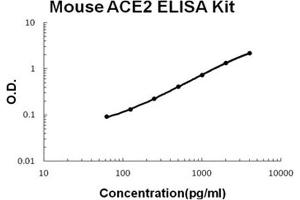 - mouse ACE2 ELISA Kit was based on standard sandwich enzyme-linked immune-sorbent assay technology. A monoclonal antibody from rat specific for ACE2 has been precoated onto 96-well plates. Standards(CHO, Q18-T740) and test samples are added to the wells, a biotinylated detection polyclonal antibody from goat specific for ACE2 is added subsequently and then followed by washing with PBS or TBS buffer. Avidin-Biotin-Peroxidase Complex was added and unbound conjugates were washed away with PBS or TBS buffer. HRP substrate TMB was used to visualize HRP enzymatic reaction. TMB was catalyzed by HRP to produce a blue color product that changed into yellow after adding acidic stop solution. The density of yellow is proportional to the mouse ACE2 amount of sample captured in plate.