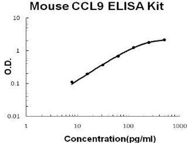 - mouse CCL9 ELISA Kit was based on standard sandwich enzyme-linked immune-sorbent assay technology. A monoclonal antibody from rat specific for CCL9 has been precoated onto 96-well plates. Standards(E.coli, Q22-Q122) and test samples are added to the wells, a biotinylated detection polyclonal antibody from goat specific for CCL9 is added subsequently and then followed by washing with PBS or TBS buffer. Avidin-Biotin-Peroxidase Complex was added and unbound conjugates were washed away with PBS or TBS buffer. HRP substrate TMB was used to visualize HRP enzymatic reaction. TMB was catalyzed by HRP to produce a blue color product that changed into yellow after adding acidic stop solution. The density of yellow is proportional to the mouse CCL9 amount of sample captured in plate.