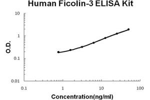 - human Ficolin-3 ELISA Kit was based on standard sandwich enzyme-linked immune-sorbent assay technology. A monoclonal antibody from mouse specific for Ficolin-3 has been precoated onto 96-well plates. Standards(NSO, Q24-R299) and test samples are added to the wells, a biotinylated detection polyclonal antibody from goat specific for Ficolin-3 is added subsequently and then followed by washing with PBS or TBS buffer. Avidin-Biotin-Peroxidase Complex was added and unbound conjugates were washed away with PBS or TBS buffer. HRP substrate TMB was used to visualize HRP enzymatic reaction. TMB was catalyzed by HRP to produce a blue color product that changed into yellow after adding acidic stop solution. The density of yellow is proportional to the human Ficolin-3 amount of sample captured in plate.