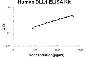 - human DLL1 ELISA Kit was based on standard sandwich enzyme-linked immune-sorbent assay technology. A monoclonal antibody from mouse specific for DLL1 has been precoated onto 96-well plates. Standards(NSO, S22-G540) and test samples are added to the wells, a biotinylated detection polyclonal antibody from goat specific for DLL1 is added subsequently and then followed by washing with PBS or TBS buffer. Avidin-Biotin-Peroxidase Complex was added and unbound conjugates were washed away with PBS or TBS buffer. HRP substrate TMB was used to visualize HRP enzymatic reaction. TMB was catalyzed by HRP to produce a blue color product that changed into yellow after adding acidic stop solution. The density of yellow is proportional to the human DLL1 amount of sample captured in plate.