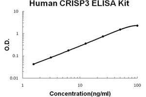 - human CRISP3 ELISA Kit was based on standard sandwich enzyme-linked immune-sorbent assay technology. A monoclonal antibody from mouse specific for CRISP3 has been precoated onto 96-well plates. Standards(NSO, N21-Y245) and test samples are added to the wells, a biotinylated detection polyclonal antibody from goat specific for CRISP3 is added subsequently and then followed by washing with PBS or TBS buffer. Avidin-Biotin-Peroxidase Complex was added and unbound conjugates were washed away with PBS or TBS buffer. HRP substrate TMB was used to visualize HRP enzymatic reaction. TMB was catalyzed by HRP to produce a blue color product that changed into yellow after adding acidic stop solution. The density of yellow is proportional to the human CRISP3 amount of sample captured in plate.