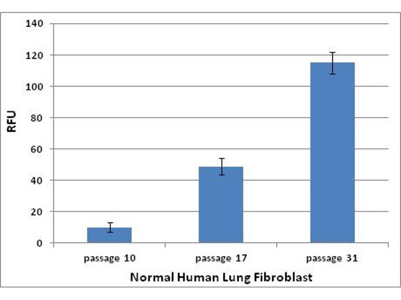 - Normal primary cells proliferate in culture for a limited number of population doublings prior to undergoing terminal growth arrest and acquiring a senescent phenotype. This finite life span correlates with the age of the organism and with the life expectancy of the species from which the cells were obtained, such that the older the age or the shorter the life span, the less the ability of the cells to undergo population doubling. Senescent cells are characterized by an irreversible G1 growth arrest involving the repression of genes that drive cell cycle progression and the upregulation of cell cycle INK4a CIP1 inhibitors like p16 , p53, and its transcriptional target, p21 . They are resistant to mitogen- induced proliferation, and assume a characteristic enlarged, flattened morphology. Research into the pathways that positively regulate senescence and ways cells bypass senescence is therefore critical in understanding carcinogenesis. Normal cells have several mechanisms in place to protect against uncontrolled proliferation and tumorigenesis. Senescent cells show common biochemical markers such as expression of an acidic senescence- associated ß-galactosidase (SA-ß-Gal) activity. While senescence has been characterized primarily in cultured cells, there is also evidence that it occurs in vivo. Cells expressing markers of senescence such as SA-ß-Gal have been identified in normal tissues. The 96-well Cellular Senescence Assay Kit provides an easy-to-use and efficient method to determine the cellular senescence by measuring SA-ß-Gal activity using a fluorometric substrate. This quantitative assay uses cell lysate for both SA-β-galactosidase activity determination and normalization of samples containing different cell numbers. Each Trial Size kit provides sufficient quantities to perform up to 24 assays in a 96-well plate.