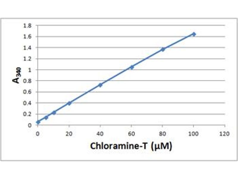 - Read the absorbance of each well immediately on a spectrophotometric plate reader using 340 nm as the primary wave length. Use the 0μM Chloramine standard as an absorbance blank.