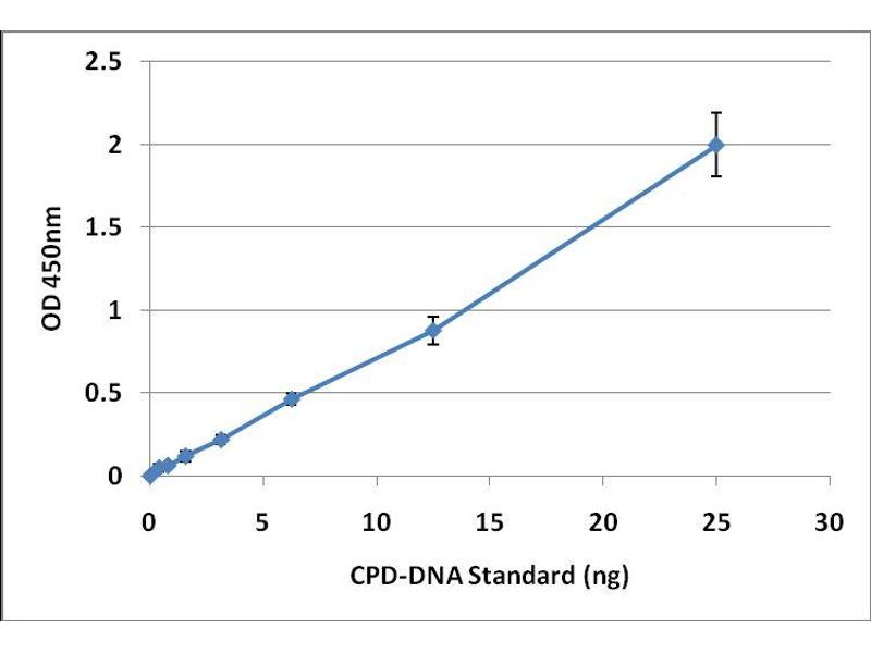 CDP-DNA standards or unknown DNA samples are first heat denatured before being adsorbed onto a 96-well DNA high-binding plate. The CPDs present in the sample or standard are probed with an anti- CPD antibody, followed by an HRP conjugated secondary antibody. The CPD content in an unknown sample is determined by comparing with a standard curve that is prepared from predetermined CPD- DNA standards.