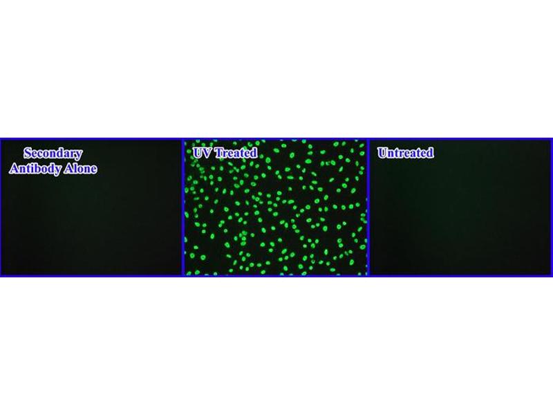 Cells are first seeded in a 96-well tissue culture plate. Wells are then UV irradiated to induce DNA damage. After fixation and denaturation, cells containing CPD damage are probed with an anti-CPD antibody, followed by a FITC conjugated secondary antibody. The unbound secondary antibody is removed during a wash step, and stained cells can then be visualized with a fluorescence microscope.