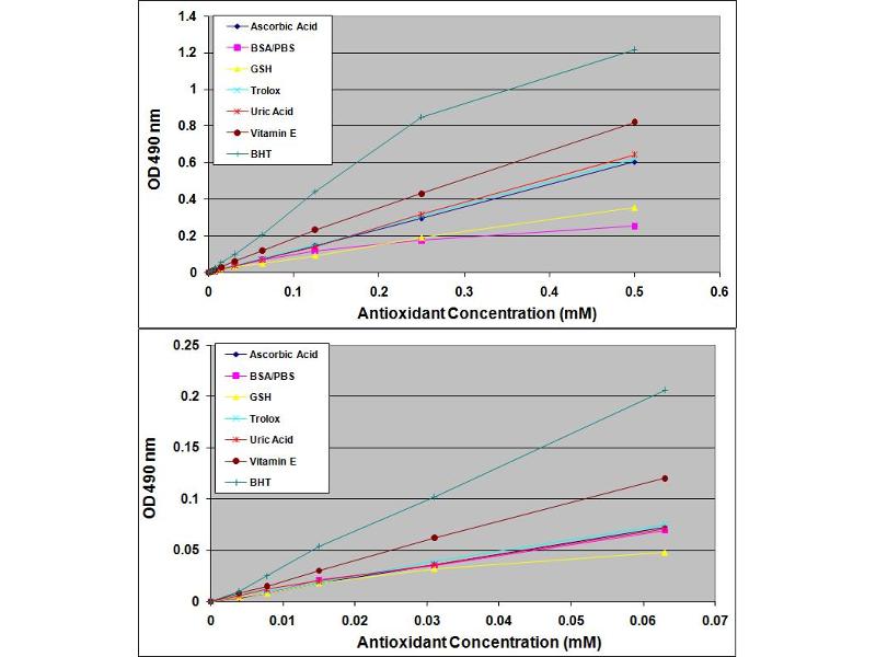 - OxiSelect™ Total Antioxidant Capacity (TAC) Assay Kit measures the total antioxidant capacity of biomolecules from a variety of samples via a SET mechanism. The TAC Assay is based on the reduction of copper (II) to copper (I) by antioxidants such as uric acid. Upon reduction, the copper (I) ion further reacts with a coupling chromogenic reagent that produces a color with a maximum absorbance at 490 nm. The net absorbance values of antioxidants are compared with a known uric acid standard curve. Absorbance values are proportional to the sample's total reductive capacity. Results are expressed as ""μM Copper Reducing Equivalents"" or "" mM Uric Acid Equivalents"". Copper is advantageous over iron-based antioxidant assays because all classes of antioxidants, including thiols, are detected with marginal radical interference. In addition, the kinetics of the copper-based reaction is also faster than the iron-based reaction, which makes the TAC Assay an ideal tool for estimating reductive or antioxidant capacity efficiently and accurately. OxiSelect™ TAC Assay Kit is a fast and reliable kit for the direct measurement of total antioxidant capacity from cell lysate, plasma, serum, urine, tissue homogenates, and food extracts. Each kit provides sufficient reagents to perform up to 200 assays, including blanks, antioxidant standards and unknown samples. Hydrophilic and lipophilic samples are compatible with the assay.