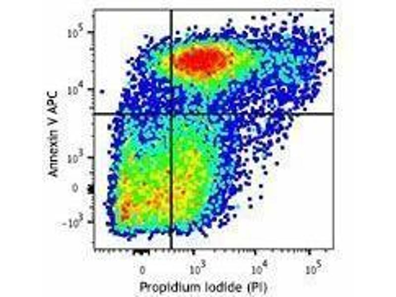 - APC Annexin V Apoptosis Detection Kit with PI has been specifically designed for the identification of apoptotic and necrotic cells. Annexin V (or Annexin A5) is a member of the annexin family of intracellular proteins that binds to phosphatidylserine (PS) in a calcium-dependent manner. PS is normally only found on the intracellular leaflet of the plasma membrane in healthy cells, but during early apoptosis, membrane asymmetry is lost and PS translocates to the external leaflet. Fluorochrome-labeled Annexin V can then be used to specifically target and identify apoptotic cells. Annexin V Binding Buffer is recommended for use with Annexin V staining. Annexin V binding alone cannot differentiate between apoptotic and necrotic cells. To help distinguish between the necrotic and apoptotic cells we recommend use of our Propidium Iodide Solution (PI). Early apoptotic cells will exclude PI, while late stage apoptotic cells and necrotic cells will stain positively, due to the passage of these dyes into the nucleus where they bind to DNA. Propidium iodide is a fluorescent dye that binds to DNA. When excited by 488 nm laser light, it can be detected with in the PE/Texas Red® channel with a bandpass filter 610/10. It is commonly used in evaluation of cell viability or DNA content in cell cycle analysis by flow cytometry.