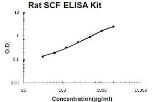 - rat SCF ELISA Kit was based on standard sandwich enzyme-linked immune-sorbent assay technology. A monoclonal antibody from mouse specific for SCF has been precoated onto 96-well plates. Standards (E.coli, Q26-A190) and test samples are added to the wells, a biotinylated detection polyclonal antibody from goat specific for SCF is added subsequently and then followed by washing with PBS or TBS buffer. Avidin-Biotin-Peroxidase Complex was added and unbound conjugates were washed away with PBS or TBS buffer. HRP substrate TMB was used to visualize HRP enzymatic reaction. TMB was catalyzed by HRP to produce a blue color product that changed into yellow after adding acidic stop solution. The density of yellow is proportional to the rat SCF amount of sample captured in plate.