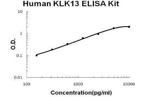 - human KLK13 ELISA Kit was based on standard sandwich enzyme-linked immune-sorbent assay technology. A monoclonal antibody from mouse specific for KLK13 has been precoated onto 96-well plates. Standards (NSO,G17-Q277) and test samples are added to the wells, a biotinylated detection polyclonal antibody from goat specific for KLK13 is added subsequently and then followed by washing with PBS or TBS buffer. Avidin-Biotin-Peroxidase Complex was added and unbound conjugates were washed away with PBS or TBS buffer. HRP substrate TMB was used to visualize HRP enzymatic reaction. TMB was catalyzed by HRP to produce a blue color product that changed into yellow after adding acidic stop solution. The density of yellow is proportional to the human KLK13 amount of sample captured in plate.