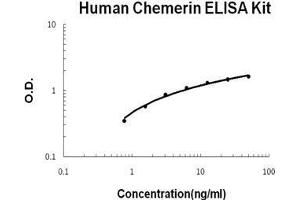 - human Chemerin ELISA Kit was based on standard sandwich enzyme-linked immune-sorbent assay technology. A monoclonal antibody from mouse specific for Chemerin has been precoated onto 96-well plates. Standards(E.coli, V17-S163) and test samples are added to the wells, a biotinylated detection polyclonal antibody from goat specific for Chemerin is added subsequently and then followed by washing with PBS or TBS buffer. Avidin-Biotin-Peroxidase Complex was added and unbound conjugates were washed away with PBS or TBS buffer. HRP substrate TMB was used to visualize HRP enzymatic reaction. TMB was catalyzed by HRP to produce a blue color product that changed into yellow after adding acidic stop solution. The density of yellow is proportional to the human Chemerin amount of sample captured in plate.