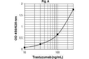 - The Trastuzumab ELISA is a sandwitch-type ELISA. Standards and diluted samples (serum or plasma) are incubated in the microtitre plate coated with the ligand antigen (i.e. recombinant human HER2) for Trastuzumab. After incubation, the wells are washed. A horseradish peroxidase (HRP)- conjugated anti-human IgG monoclonal antibody is added and binds to the Fc part of Trastuzumab pre-captured by the ligand antigen on the surface of the wells. Following incubation, the wells are washed and the bound enzymatic activity is detected by addition of chromogen-substrate. The colour developed is proportional to the amount of Trastuzumab in the sample or standard. Results of samples are determined directly by using the standard curve.