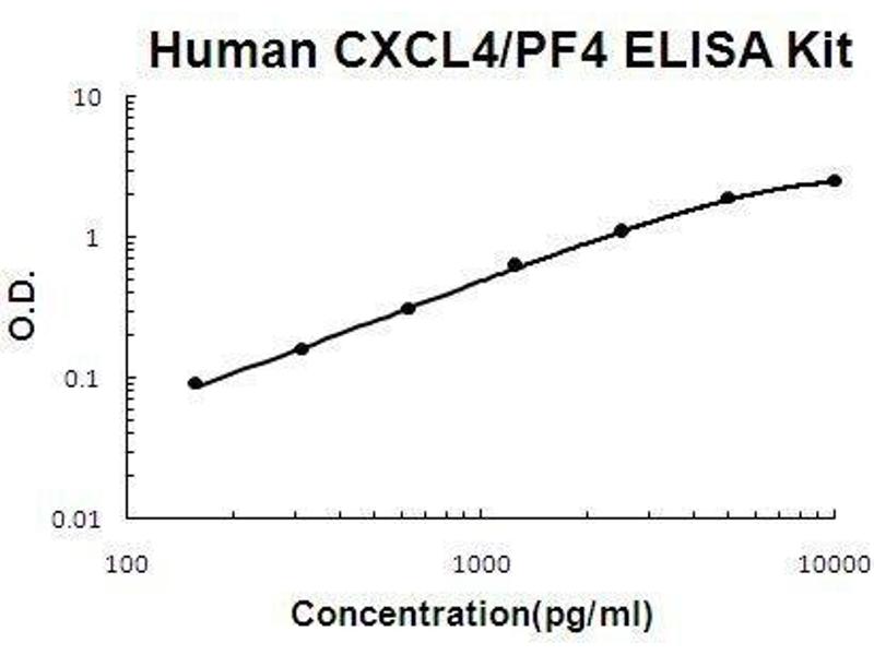 - human CXCL4 ELISA Kit was based on standard sandwich enzyme-linked immune-sorbent assay technology. A monoclonal antibody from mouse specific for CXCL4 has been precoated onto 96-well plates. Standards(Expression system for standard: E.coli, Immunogen sequence: E32-S101) and test samples are added to the wells, a biotinylated detection polyclonal antibody from goat specific for CXCL4 is added subsequently and then followed by washing with PBS or TBS buffer. Avidin-Biotin-Peroxidase Complex was added and unbound conjugates were washed away with PBS or TBS buffer. HRP substrate TMB was used to visualize HRP enzymatic reaction. TMB was catalyzed by HRP to produce a blue color product that changed into yellow after adding acidic stop solution. The density of yellow is proportional to the human CXCL4 amount of sample captured in plate.