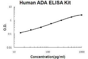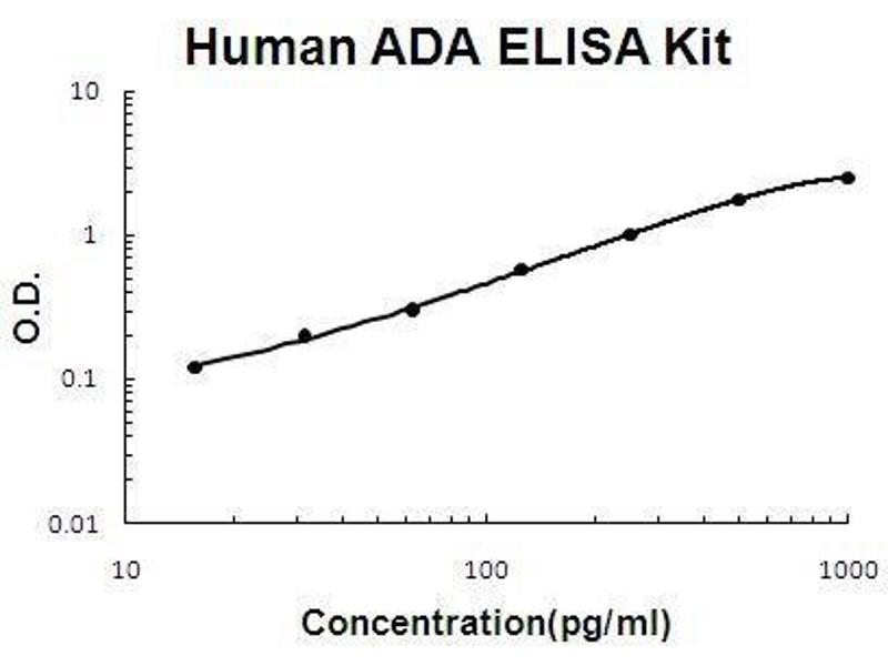 - human ADA ELISA Kit was based on standard sandwich enzyme-linked immune-sorbent assay technology. A monoclonal antibody from mouse specific for ADA has been precoated onto 96-well plates. Standards(Expression system for standard: sf21, Immunogen sequence: A2-L363) and test samples are added to the wells, a biotinylated detection polyclonal antibody from goat specific for ADA is added subsequently and then followed by washing with PBS or TBS buffer. Avidin-Biotin-Peroxidase Complex was added and unbound conjugates were washed away with PBS or TBS buffer. HRP substrate TMB was used to visualize HRP enzymatic reaction. TMB was catalyzed by HRP to produce a blue color product that changed into yellow after adding acidic stop solution. The density of yellow is proportional to the human ADA amount of sample captured in plate.