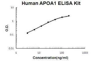 - human APOA1 ELISA Kit was based on standard sandwich enzyme-linked immune-sorbent assay technology. A monoclonal antibody from mouse specific for APOA1 has been precoated onto 96-well plates. Standards(Expression system for standard: E.coli, mmunogen sequence: D25-Q267) and test samples are added to the wells, a biotinylated detection polyclonal antibody from goat specific for APOA1 is added subsequently and then followed by washing with PBS or TBS buffer. Avidin-Biotin-Peroxidase Complex was added and unbound conjugates were washed away with PBS or TBS buffer. HRP substrate TMB was used to visualize HRP enzymatic reaction. TMB was catalyzed by HRP to produce a blue color product that changed into yellow after adding acidic stop solution. The density of yellow is proportional to the human APOA1 amount of sample captured in plate.