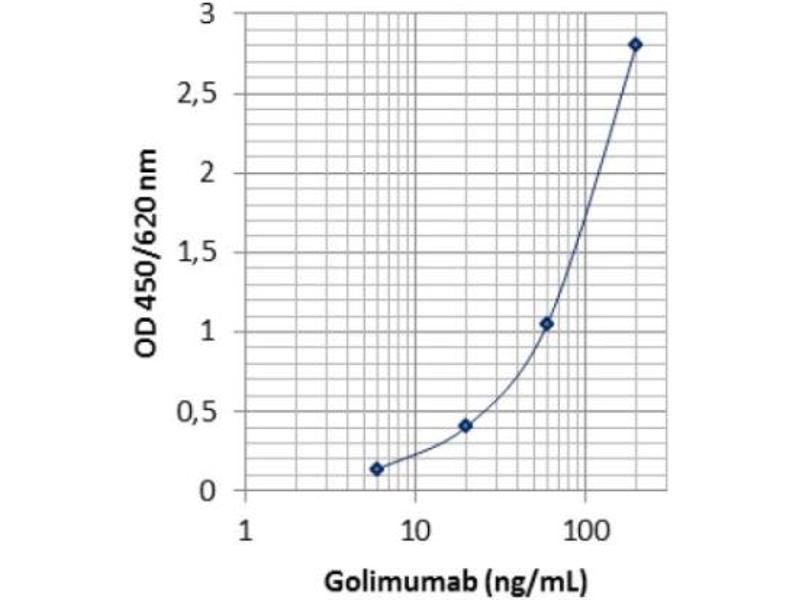 - There is no cross reaction with any other proteins present in native human serum. A screening test was performed with 48 different native human sera. All produced OD450/620 nm values (ranged from 0.008 to 0.115) less than the mean OD (0.168) of standard D (10 ng/mL). In addition, binding of Golimumab is inhibited by recombinant human TNF-α in a concentration dependent manner. Therefore, the Golimumab ELISA (mAb-Based) measures the biologically active free form of Golimumab, i.e. not pre-occuppied by TNF. No cross reaction was observed with sera spiked with the other therapeutic antibodies including Infliximab, Adalimumab, Etanercept, Rituximab, Trastuzumab, Tocillizumab, Omalizumab and Bevacizumab at concentrations up to 2 mg/mL. All produced mean OD450/620 nm values ranged from 0.008 to 0. 013.