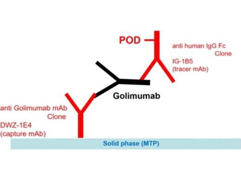 - This ELISA is based on Golimumab-specific mouse monoclonal antibody (catcher Ab, clone DWZ-1E4). Standards and diluted samples are incubated in the microtiter plate coated with IG-DWZ-1E4 mAb. After incubation, the wells are washed. A horseradish peroxidase (HRP)-conjugated anti-human IgG monoclonal antibody is added and binds to the Fc part of Golimumab. Following incubation, wells are washed and the bound enzymatic activity is detected by addition of chromogen-substrate. The colour developed is proportional to the amount of Golimumab in the sample or standard. Results of samples can be determined by using the standard curve. Binding of Golimumab to the solid phase, pre-coated with DWZ-1E4, is inhibited by human TNF-α in a concentration dependent manner. Therefore, the Golimumab ELISA (mAb-Based) measures the free form of Golimumab.