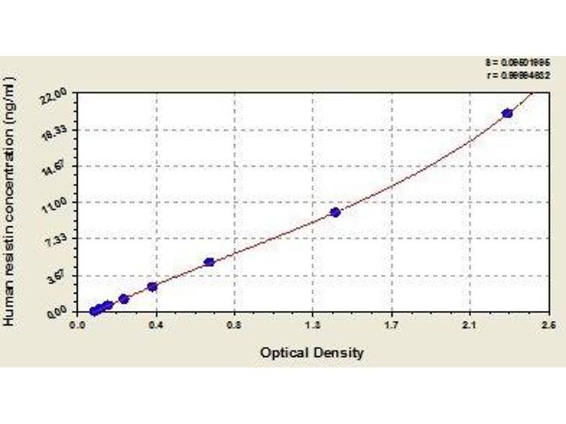 - This assay employs the quantitative sandwich enzyme immunoassay technique. Antibody specific for resistin has been pre-coated onto a microplate. Standards and samples are pipetted into the wells and any resistin present is bound by the immobilized antibody. After removing any unbound substances, a biotin-conjugated antibody specific for resistin is added to the wells. After washing, avidin conjugated Horseradish Peroxidase (HRP) is added to the wells. Following a wash to remove any unbound avidin-enzyme reagent, a substrate solution is added to the wells and color develops in proportion to the amount of resistin bound in the initial step. The color development is stopped and the intensity of the color is measured.