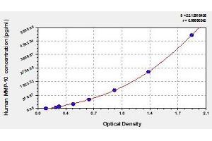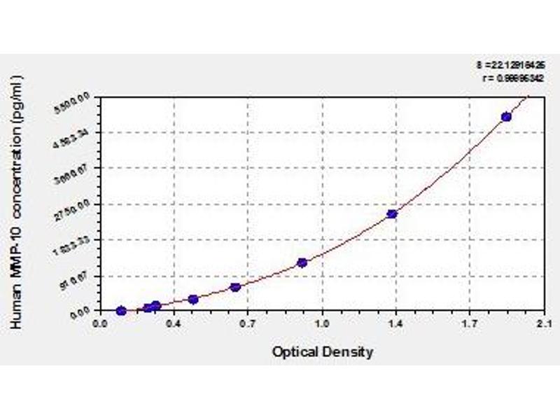 Antibody specific for MMP10 has been pre-coated onto a microplate. Standards and samples are pipetted into the wells and any MMP10 present is bound by the immobilized antibody. After removing any unbound substances, a biotin-conjugated antibody specific for MMP10 is added to the wells. After washing, avidin conjugated Horseradish Peroxidase (HRP) is added to the wells. Following a wash to remove any unbound avidin-enzyme reagent, a substrate solution is added to the wells and color develops in proportion to the amount of MMP10 bound in the initial step. The color development is stopped and the intensity of the color is measured.
