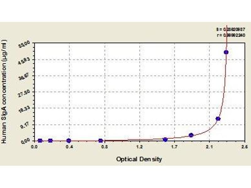 Create a standard curve by reducing the data using computer software capable of generating a four parameter logistic (4-PL) curve fit. As an alternative, construct a standard curve by plotting the mean absorbance for each standard on the x-axis against the concentration on the y-axis and draw a best fit curve through the points on the graph. The data may be linearized by plotting the log of the target antigen concentration versus the log of the O.D. and the best fit line can be determined by regression analysis. This procedure will produce an adequate but less precise fit of the data.