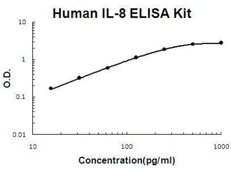 - human IL-8 ELISA Kit was based on standard sandwich enzyme-linked immune-sorbent assay technology. A monoclonal antibody from mouse specific for IL-8 has been precoated onto 96-well plates. Standards(E.coli, S28-S99) and test samples are added to the wells, a biotinylated detection polyclonal antibody from goat specific for IL-8 is added subsequently and then followed by washing with PBS or TBS buffer. Avidin-Biotin-Peroxidase Complex was added and unbound conjugates were washed away with PBS or TBS buffer. HRP substrate TMB was used to visualize HRP enzymatic reaction. TMB was catalyzed by HRP to produce a blue color product that changed into yellow after adding acidic stop solution. The density of yellow is proportional to the human IL-8 amount of sample captured in plate.