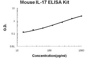 - mouse IL-17 ELISA Kit was based on standard sandwich enzyme-linked immune-sorbent assay technology. A monoclonal antibody from rat specific for IL-17 has been precoated onto 96-well plates. Standards(E.coli, T22-A158) and test samples are added to the wells, a biotinylated detection polyclonal antibody from goat specific for IL-17 is added subsequently and then followed by washing with PBS or TBS buffer. Avidin-Biotin-Peroxidase Complex was added and unbound conjugates were washed away with PBS or TBS buffer. HRP substrate TMB was used to visualize HRP enzymatic reaction. TMB was catalyzed by HRP to produce a blue color product that changed into yellow after adding acidic stop solution. The density of yellow is proportional to the mouse IL-17 amount of sample captured in plate.