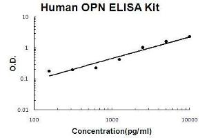 - human OPN ELISA Kit was based on standard sandwich enzyme-linked immune-sorbent assay technology. A monoclonal antibody from mouse specific for OPN has been precoated onto 96-well plates. Standards(NSO, I17-N300) and test samples are added to the wells, a biotinylated detection polyclonal antibody from goat specific for OPN is added subsequently and then followed by washing with PBS or TBS buffer. Avidin-Biotin-Peroxidase Complex was added and unbound conjugates were washed away with PBS or TBS buffer. HRP substrate TMB was used to visualize HRP enzymatic reaction. TMB was catalyzed by HRP to produce a blue color product that changed into yellow after adding acidic stop solution. The density of yellow is proportional to the human OPN amount of sample captured in plate.