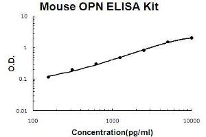- mouse OPN ELISA Kit was based on standard sandwich enzyme-linked immune-sorbent assay technology. A monoclonal antibody from rat specific for OPN has been precoated onto 96-well plates. Standards(NSO, L17-N294) and test samples are added to the wells, a biotinylated detection polyclonal antibody from goat specific for OPN is added subsequently and then followed by washing with PBS or TBS buffer. Avidin-Biotin-Peroxidase Complex was added and unbound conjugates were washed away with PBS or TBS buffer. HRP substrate TMB was used to visualize HRP enzymatic reaction. TMB was catalyzed by HRP to produce a blue color product that changed into yellow after adding acidic stop solution. The density of yellow is proportional to the mouse OPN amount of sample captured in plate.