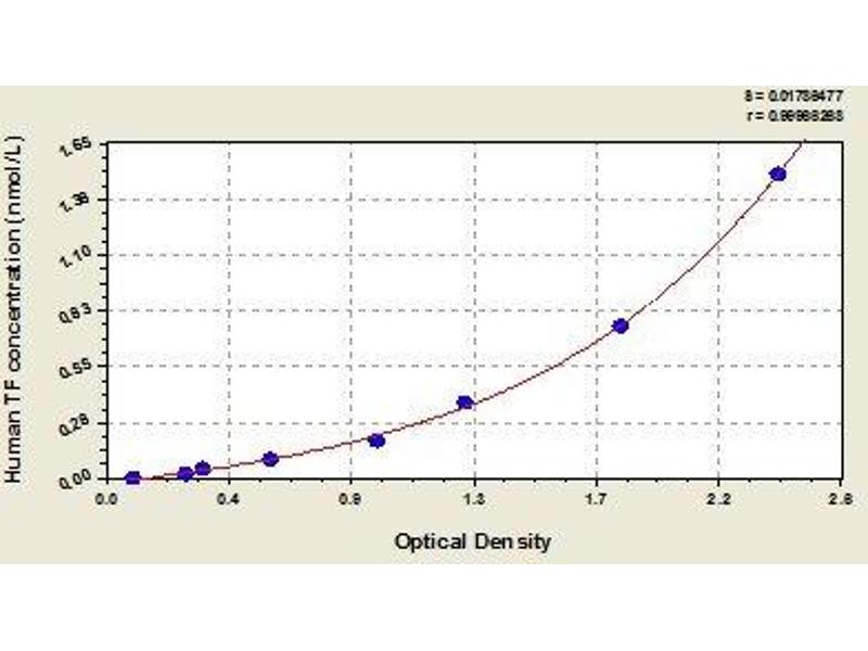 This assay employs the quantitative sandwich enzyme immunoassay technique. Antibody specific for TF has been pre-coated onto a microplate. Standards and samples are pipetted into the wells and any TF present is bound by the immobilized antibody. After removing any unbound substances, a Horseradish Peroxidase (HRP)-conjugated antibody specific for TF is added to the wells. Following a wash to remove any unbound reagent, a substrate solution is added to the wells and color develops in proportion to the amount of TF bound in the initial step. The color development is stopped and the intensity of the color is measured.