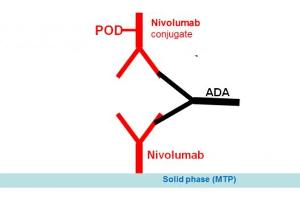 - This anti-drug antibody(ies) (ADA) kit is a bridging type ELISA for the determination of free antibodies against the drug Nivolumab in serum and plasma samples. During the first incubation period, ADA in serum or plasma samples are captured by the drug coated on the microtiter wells. After washing away the unbound components from samples, a peroxidase-labelled drug conjugate is added and then incubated. ADA, if present in sample, will make a bridge, with its identical Fab arms, between the drug coated on the well and the other drug molecule labelled with peroxidase. After a second washing step, the bound enzymatic activity is detected by addition of tetramethylbenzidine (TMB) chromogen-substrate. Finally, the reaction is terminated with stop solution. The positive reaction is expected to be related to the presence of ADA in the sample.