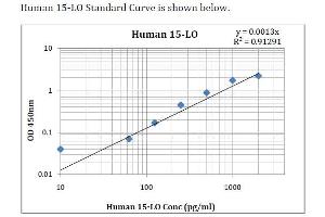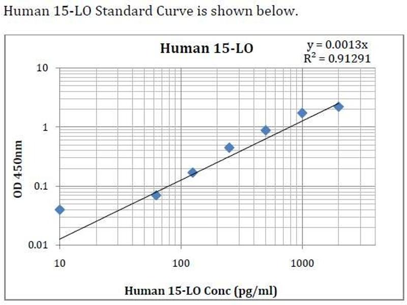 - This assay employs an antibody specific for Anti-human 15-LO coated on a 96-well plate. Standards and samples are pipetted into the wells and 15-LO present in a sample is bound to the wells by the immobilized antibody. The wells are washed and biotinylated anti-human 15-LO antibody is added. After washing away unbound biotinylated antibody, HRP-conjugated streptavidin is pipetted to the wells. The wells are again washed, a TMB substrate solution is added to the wells and color develops in proportion to the amount of 15-LO bound. The Stop Solution changes the color from blue to yellow, and the intensity of the color is measured at 450 nm.