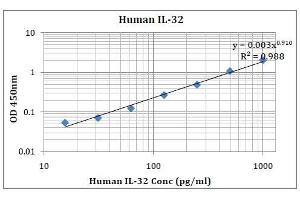 This kit was based on sandwich enzyme-linked immune-sorbent assay technology. Anti- Human IL-32 antibody was pre-coated into 96-well plates. Biotin conjugated anti-human IL-32 detection antibody was used. Standards, test samples and biotin conjugated detection antibody were added to the wells subsequently. Wash buffer was used to wash any non-specific binding. HRP conjugated Streptavidin was used as secondary antibody. TMB substrates were used to visualize HRP enzymatic reaction. TMB was catalyzed by HRP to produce a blue color product that changed into yellow after adding acidic stop solution. The density of yellow is proportional to the Human IL-32 amount of samples captured in the plate. Optical Density (O.D) can be read at absorbance 450nm in a microplate reader. Concentration of Human IL-32 can be calculated using the standard curve.