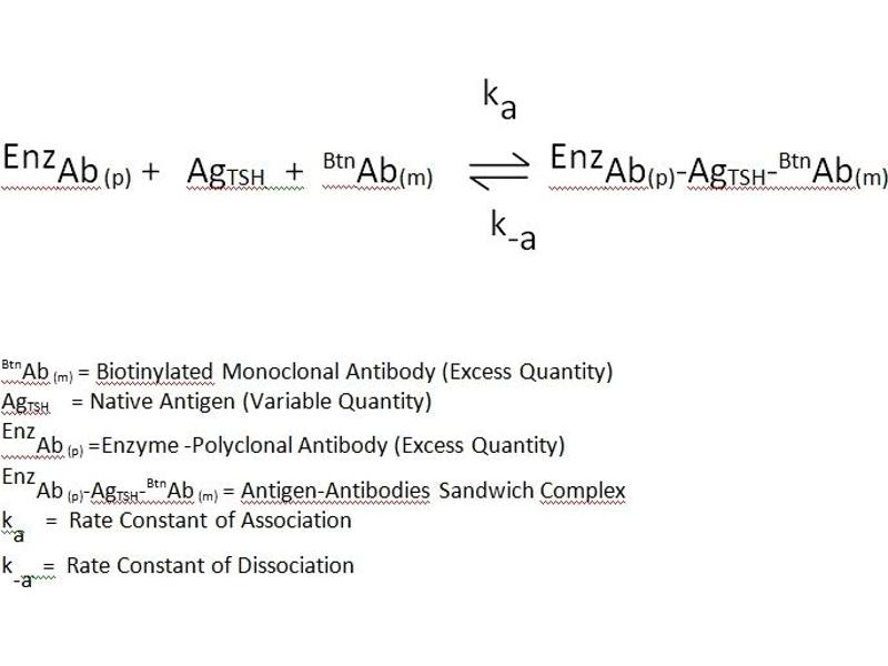 - Immunoenzymometric assay (TYPE 3): The essential reagents required for an immunoenzymometric assay include high affinity and specificity antibodies (enzyme and immobilized), with different and distinct epitope recognition, in excess, and native antigen. In this procedure, the immobilization takes place during the assay at the surface of a microplate well through the interaction of streptavidin coated on the well and exogenously added biotinylated monoclonal anti-PSA antibody. Upon mixing monoclonal biotinylated antibody, the enzyme-labeled antibody and a serum containing the native antigen, reaction results between the native antigen and the antibodies, without competition or steric hindrance, to form a soluble sandwich complex.
