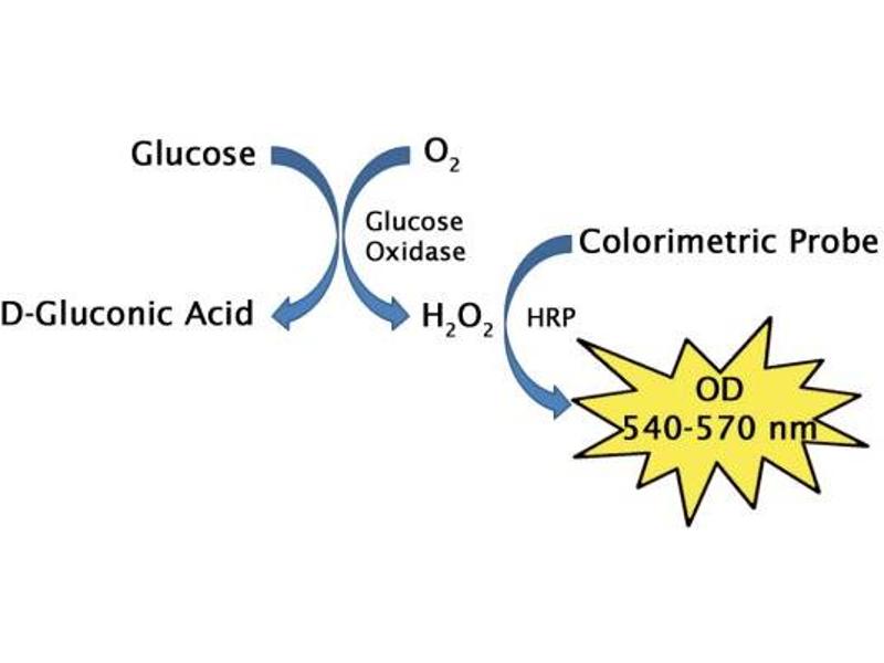 - Total Glucose Assay Kit measures total glucose within food or biological samples. Glucose is oxidized by glucose oxidase into D-gluconic acid plus hydrogen peroxide. The hydrogen peroxide is then detected with a highly specific colorimetric probe. Horseradish peroxidase catalyzes the reaction between the probe and hydrogen peroxide, which bind in a 1:1 ratio. Samples are compared to a known concentration of glucose standard within the 96-well microtiter plate format. Samples and standards are incubated for 30-45 minutes and then read with a standard 96-well colorimetric plate reader . . Glucose assay principle.