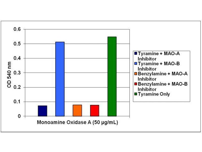 - OxiSelect™ Monoamine Oxidase Assay Kit is a simple HTS-compatible assay for measuring amine oxidase activity. The assay can detect both MAO activity and semicarbizide- sensitive amine oxidases (SSAO). In order to discriminate between MAO-A and MAO-B, the MAO-A inhibitor Clorgyline and MAO-B inhibitor Pargyline are included. In addition, two substrates, Tyramine, and Benzylamine Hydrochloride, are included. Tyramine will react with MAO-A, MAO-B, and SSAO, while Benzylamine will react with MAO-B and SSAO. The two amine oxidase substrates are interchangeable in the assay, and coupled with the provided MAO inhibitors, can be used to determine MAO activity. Applications for the kit include measuring amine oxidase in tissues, blood samples, and screening for amine oxidase inhibitors or substrates. The kit has a detection sensitivity limit of 0.01 U/L. Each kit provides sufficient reagents to perform up to 96 assays, including standard curve and unknown samples.