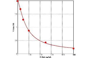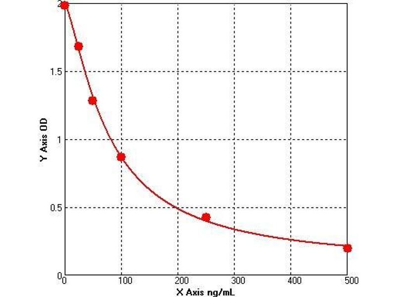 Prepare all Standards before starting assay procedure (Please read Reagents Preparation). It is recommended that all Standards and Samples be added in duplicate to the Microtiter Plate. 1. Secure the desired number of coated wells in the holder then add 50 µL of Standards or Samples to the appropriate well of the antibody pre-coated Microtiter Plate. 2. Add 50 μL of Conjugate to each well. Mix well. Complete mixing in this step is important. Cover and incubate for 1 hour at 37 °C. 3. Wash the Microtiter Plate using one of the specified methods indicated below: 4. Manual Washing: Remove incubation mixture by aspirating contents of the plate into a sink or proper waste container. Using a squirt bottle, fill each well completely with wash solution, then aspirate contents of the plate into a sink or proper waste container. Repeat this procedure four more times for a total of FIVE washes. After final wash, invert plate, and blot dry by hitting plate onto absorbent paper or paper towels until no moisture appears. Note: Hold the sides of the plate frame firmly hen washing the plate to assure that all strips remain securely in frame. 5. Automated Washing: Aspirate all wells, and then wash plate FIVE times using wash solution. Always adjust your washer to aspirate as much liquid as possible and set fill volume at 350 µL/well/wash (range: 350-400 µL). After final wash, invert plate, and blot dry by hitting plate onto absorbent paper or paper towels until no moisture appears. It is recommended that the washer be set for a soaking time of 10 seconds or shaking time of 5 seconds between washes. 6. Add 50 µL Substrate A to each well. 7.Add 50 µL Substrate B to each well. Cover and incubate for 15 minutes at 20-25 °C. (avoid sunlight) 8. Add 50 µL of Stop Solution to each well. Mix well. 9. Read the Optical Density (O.D.) at 450 nm using a microtiter plate reader immediately.