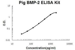 Background: Bone morphogenetic protein-2(BMP-2, BMP 2A) belongs to the transforming growth factor beta(TGF-beta) superfamily. It is thought to be involved in cartilage and bone formation during embryogenesis, but may have additional functions in morphogenesis as implied by its expression in various organs and embryonic tissues of mice.1 BMP-2 has been identified as a candidate mediator of retinoid activity. BMP-2 protein induces medulloblastoma cell apoptosis, whereas the BMP-2 antagonist noggin blocks both retinoid and BMP-2-induced apoptosis. BMP-2 also induces p38 mitogen-activated protein kinase(MAPK), which is necessary for BMP-2 and retinoid-induced apoptosis.2 Bone morphogenic proteins(BMPs) are known to promote osteogenesis, and clinical trials are currently underway to evaluate the ability of certain BMPs to promote fracture-healing and spinal fusion.3 The standard product used in this kit is recombinant Pig porcine BMP-2, constituting dimer by two chains of 114 amino acids with the molecular mass of 26KDa.