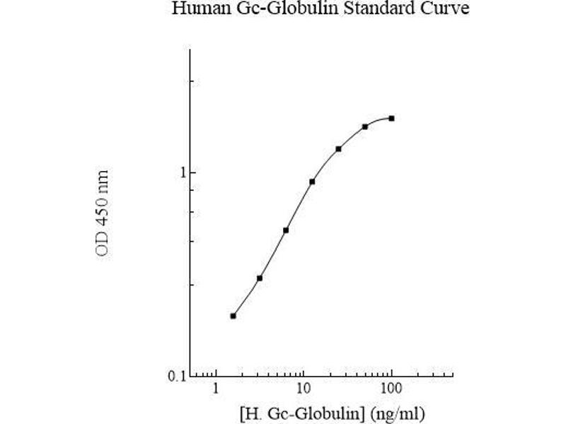 Prepare all reagents, standard solutions, and samples as instructed. Bring all reagents to room temperature before use. The assay is performed at room temperature (20-25 °C). Remove excess microplate strips from the plate frame and return them immediately to the foil pouch with desiccants inside. Reseal the pouch securely to minimize exposure to water vapor and store in a vacuum desiccator. Add 50 l of Human Gc-Globulin Standard or sample to each well. Gently tap plate to thoroughly coat the wells. Break any bubbles that may have formed. Cover wells with a sealing tape and incubate for 2 hours. Start the timer after the last addition. Wash five times with 200 l of Wash Buffer manually. Invert the plate each time and decant the contents, hit 4-5 times on absorbent material to completely remove the liquid. If using a machine, wash six times with 300 l of Wash Buffer and then invert the plate, decanting the contents, hit 4-5 times on absorbent material to completely remove the liquid. Add 50 l of Biotinylated Human Gc-Globulin Antibody to each well. Gently tap plate to thoroughly coat the wells. Break any bubbles that may have formed. Cover wells with a sealing tape and incubate for 1 hour. Wash the microplate as described above. Add 50 l of SP Conjugate to each well. Gently tap plate to thoroughly coat the wells. Break any bubbles that may have formed. Cover wells with a sealing tape and incubate for 30 minutes. Turn on the microplate reader and set up the program in advance. Wash the microplate as described above. Add 50 l of Chromogen Substrate to each well. Gently tap plate to thoroughly coat the wells. Break any bubbles that may have formed. Incubate for 15 minutes or until the optimal blue color density develops. 6 Add 50 l of Stop Solution to each well. The color will change from blue to yellow. Gently tap plate to ensure thorough mixing. Break any bubbles that may have formed. Read the absorbance on a microplate reader at a wavelength of 450 nm immediately. If wavelength correction is available, subtract readings at 570 nm from those at 450 nm to correct optical imperfections. Otherwise, read the plate at 450 nm only. Please note that some unstable black particles may be generated at high concentration points after stopping the reaction for about 10 minutes, which will reduce the readings.