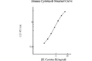 Prepare all reagents, standard solutions, and samples as instructed. Bring all reagents to room temperature before use. The assay is performed at room temperature (20-25 °C). Remove excess microplate strips from the plate frame and return them immediately to the foil pouch with desiccants inside. Reseal the pouch securely to minimize exposure to water vapor and store in a vacuum desiccator. Add 50 l of Human Cystatin-B Standard or sample to each well. Gently tap plate to thoroughly coat the wells. Break any bubbles that may have formed. Cover wells with a sealing tape and incubate for 2 hours. Start the timer after the last addition. Wash five times with 200 l of Wash Buffer manually. Invert the plate each time and decant the contents, hit 4-5 times on absorbent material to completely remove the liquid. If using a machine, wash six times with 300 l of Wash Buffer and then invert the plate, decanting the contents, hit 4-5 times on absorbent material to completely remove the liquid. Add 50 l of Biotinylated Human Cystatin-B Antibody to each well. Gently tap plate to thoroughly coat the wells. Break any bubbles that 6 may have formed. Cover wells with a sealing tape and incubate for 1 hour. Wash the microplate as described above. Add 50 l of SP Conjugate to each well. Gently tap plate to thoroughly coat the wells. Break any bubbles that may have formed. Cover wells with a sealing tape and incubate for 30 minutes. Turn on the microplate reader and set up the program in advance. Wash the microplate as described above. Add 50 l of Chromogen Substrate to each well. Gently tap plate to thoroughly coat the wells. Break any bubbles that may have formed. Incubate for 30 minutes or until the optimal blue color density develops. Add 50 l of Stop Solution to each well. The color will change from blue to yellow. Gently tap plate to ensure thorough mixing. Break any bubbles that may have formed. Read the absorbance on a microplate reader at a wavelength of 450 nm immediately. If wavelength correction is available, subtract readings at 570 nm from those at 450 nm to correct optical imperfections. Otherwise, read the plate at 450 nm only. Please note that some unstable black particles may be generated at high concentration points after stopping the reaction for about 10 minutes, which will reduce the readings.