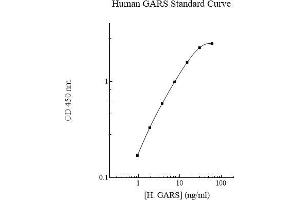 - Human GARS Microplate: A 96-well polystyrene microplate (12 strips of 8 wells) coated with a polyclonal antibody against human GARS. Sealing Tapes: Each kit contains 3 precut, pressure sensitive sealing tapes that can be cut to fit the format of the individual assay. Human GARS Standard: Human GARS in a buffered protein base (72 ng, lyophilized, 2 vials). Biotinylated Human GARS Antibody (50x): A 50-fold concentrated biotinylated polyclonal antibody against human GARS (120 l). EIA Diluent Concentrate (10x): A 10-fold concentrated buffered protein base (20 ml). Standard Diluent (1x): A buffered protein base with stabilizer (2 ml). Wash Buffer Concentrate (20x): A 20-fold concentrated buffered surfactant (30 ml, 2 bottles). SP Conjugate (100x): A 100-fold concentrate (80 l). Chromogen Substrate (1x): A stabilized peroxidase chromogen substrate tetramethylbenzidine (8 ml). Stop Solution (1x): A 0.5 N hydrochloric acid solution to stop the chromogen substrate reaction (12 ml).