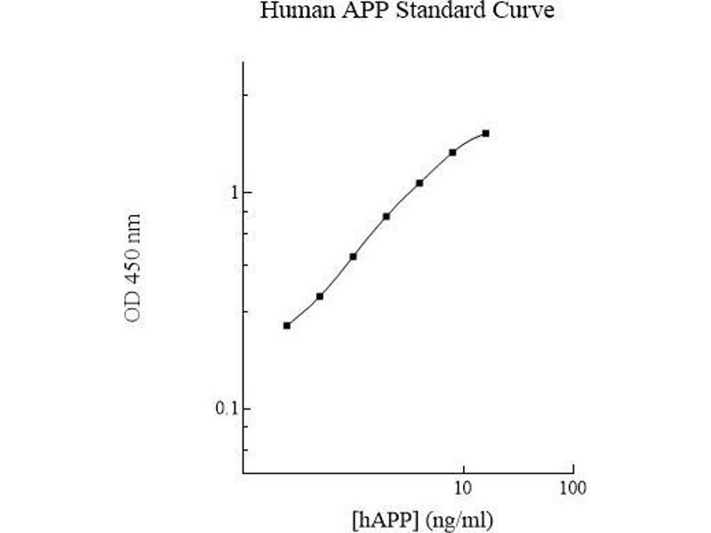Prepare all reagents, standard solutions, and samples as instructed. Bring all reagents to room temperature before use. The assay is performed at room temperature (20-25 °C). Remove excess microplate strips from the plate frame and return them immediately to the foil pouch with desiccants inside. Reseal the pouch securely to minimize exposure to water vapor and store in a vacuum desiccator. Add 50 l of Human APP Standard or sample per well. Cover wells with a sealing tape and incubate for 2 hours. Start the timer after the last addition. Wash five times with 200 l of Wash Buffer manually. Invert the plate each time and decant the contents, hit 4-5 times on absorbent material to completely remove the liquid. If using a machine, wash six times with 300 l of Wash Buffer and then invert the plate, decanting the contents, hit 4-5 times on absorbent material to completely remove the liquid. Add 50 l of Biotinylated Human APP Antibody to each well and incubate for 1 hour. 5 Wash the microplate as described above. Add 50 l of Streptavidin-Peroxidase Conjugate to each well and incubate for 30 minutes. Turn on the microplate reader and set up the program in advance. Wash the microplate as described above. Add 50 l of Chromogen Substrate per well and incubate for 12 minutes or till the optimal blue color density develops. Gently tap plate to ensure thorough mixing and break the bubbles in the well with pipette tip. Add 50 l of Stop Solution to each well. The color will change from blue to yellow. Read the absorbance on a microplate reader at a wavelength of 450 nm immediately. If wavelength correction is available, subtract readings at 570 nm from those at 450 nm to correct optical imperfections. Otherwise, read the plate at 450 nm only. Please note that some unstable black particles may be generated at high concentration points after stopping the reaction for about 10 minutes, which will reduce the readings.