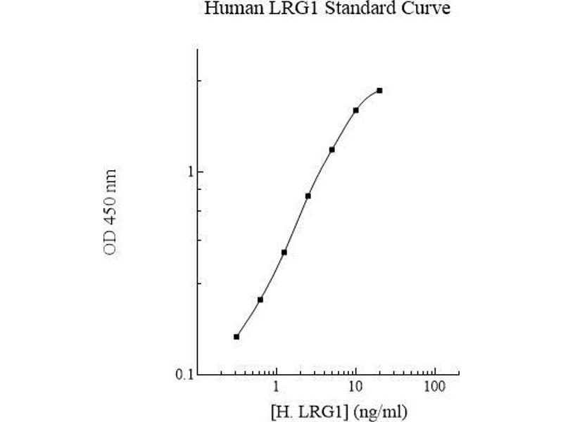 Prepare all reagents, standard solutions, and samples as instructed. Bring all reagents to room temperature before use. The assay is performed at room temperature (20-25 °C). Remove excess microplate strips from the plate frame and return them immediately to the foil pouch with desiccants inside. Reseal the pouch securely to minimize exposure to water vapor and store in a vacuum desiccator. Add 50 l of Human LRG1 Standard or sample to each well. Gently tap plate to thoroughly coat the wells. Break any bubbles that may have formed. Cover wells with a sealing tape and incubate for 2 hours. Start the timer after the last addition. Wash five times with 200 l of Wash Buffer manually. Invert the plate each time and decant the contents, hit 4-5 times on absorbent material to completely remove the liquid. If using a machine, wash six times with 300 l of Wash Buffer and then invert the plate, decanting the contents, hit 4-5 times on absorbent material to completely remove the liquid. Add 50 l of Biotinylated Human LRG1 Antibody to each well. Gently tap plate to thoroughly coat the wells. Break any bubbles that may have formed. Cover wells with a sealing tape and incubate for 1 hour. Wash the microplate as described above. 6 Add 50 l of Streptavidin-Peroxidase Conjugate to each well. Gently tap plate to thoroughly coat the wells. Break any bubbles that may have formed. Cover wells with a sealing tape and incubate for 30 minutes. Turn on the microplate reader and set up the program in advance. Wash the microplate as described above. Add 50 l of Chromogen Substrate to each well. Gently tap plate to thoroughly coat the wells. Break any bubbles that may have formed. Incubate for 20 minutes or until the optimal blue color density develops. Add 50 l of Stop Solution to each well. The color will change from blue to yellow. Gently tap plate to ensure thorough mixing. Break any bubbles that may have formed. Read the absorbance on a microplate reader at a wavelength of 450 nm immediately. If wavelength correction is available, subtract readings at 570 nm from those at 450 nm to correct optical imperfections. Otherwise, read the plate at 450 nm only. Please note that some unstable black particles may be generated at high concentration points after stopping the reaction for about 10 minutes, which will reduce the readings.