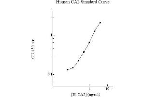 - The AssayMax™ Human Carbonic Anhydrase 2 ELISA (Enzyme-Linked Immunosorbent Assay) Kit is designed for detection of CA2 in human plasma, serum, and cell culture samples. This assay employs a quantitative sandwich enzyme immunoassay technique that measures human CA2 in approximately 4 hours. A polyclonal antibody specific for human CA2 has been pre-coated onto a 96-well microplate with removable strips. CA2 in standards and samples is sandwiched by the immobilized antibody and a biotinylated polyclonal antibody specific for human CA2, which is recognized by a streptavidin-peroxidase (SP) conjugate. All unbound material is washed away and a peroxidase enzyme substrate is added. The color development is stopped and the intensity of the color is measured.