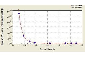 - This assay employs the quantitative sandwich enzyme immunoassay technique. Antibody specific for KYN has been pre-coated onto a microplate. Standards and samples are pipetted into the wells and any KYN present is bound by the immobilized antibody. After removing any unbound substances, a biotin-conjugated antibody specific for KYN is added to the wells. After washing, avidin conjugated Horseradish Peroxidase (HRP) is added to the wells. Following a wash to remove any unbound avidin-enzyme reagent, a substrate solution is added to the wells and color develops in proportion to the amount of KYN bound in the initial step. The color development is stopped and the intensity of the color is measured.