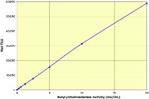 - The Butyrylcholinesterase (BChE) Fluorescent Activity kit is a simple, sensitive and stable kit that measures BChE activity in a wide variety of samples. The kit contains everything needed to measure activity, including the microtiter plate. Diluted samples are added to the wells. The reaction is initiated by addition of a reaction mix containing the butyrylthiocholine substrate and ThioStar®. After a 20 minute incubation, the signal is read at 510nm with excitation at 390nm. The activity can also be read kinetically. A stable human BChE standard solution is provided to generate a standard curve for the assay. The assay shows almost zero reactivity with AChE. Butyrylcholinesterase (BChE) belongs to the same structural class of proteins as acetylcholinesterase (AChE). The 440kDa tetrameric glycoprotein is predominantly found in blood, kidneys, intestine, liver, lung, heart and the central nervous system. Many species, such as human, horse and mice exhibit high BChE activity in plasma, whereas rats have higher acetylcholinesterase activity in plasma. A deficiency of BChE can result in delayed metabolism of various drugs, such as cocaine, and treatment with doses of BChE can help in overcoming the physiological reaction to them. In Alzheimer's disease therapeutics, the use of potent cholinesterase inhibitors protect the limited acetylcholine levels, acting on both AChE and BChE. BChE may have roles in attention, executive function, emotional memory and behaviour. Other intentional or environmental methods of impairment are organophosphates and carbamates with anticholinergic properties, which are used as insecticides worldwide or as warfare agents.